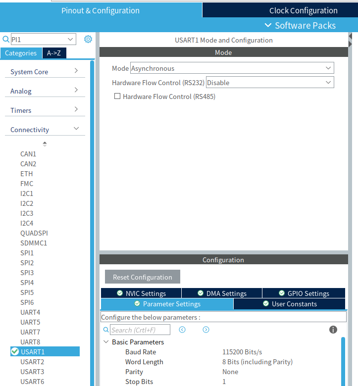 이제 핀 맵 왼쪽의 Connectivity 항목에서 USART1을 선택하고 Mode를 Asynchronous(비동기)로 선택한다.