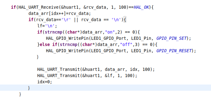 1. HAL_UART_Receive 함수를 사용하여 rcv_data라는 변수에 1바이트씩 데이터를 받아 data_arr라는 버퍼에 저장시켰다.
