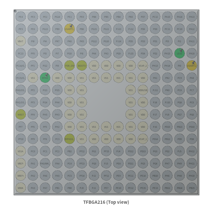 회로도에서 VCP_TX는 PA9 , VCP_RX는 PB7 인 것을 확인하고 해당 번호의 핀을 클릭하여 각각 USART1_TX, USART1_RX로 선택한다. (선택시 해당 핀 노란색으로 변화)