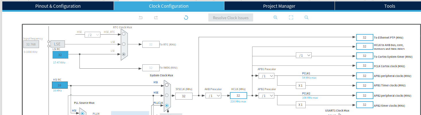 먼저 사용한 클럭을 알아야하는데 클럭은 32MHz로 선택을 하였었다. (Clock Configuration 에서 설정 및 확인 가능)