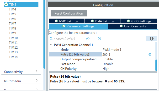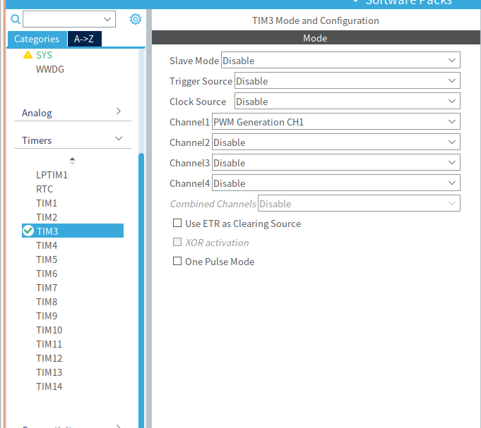 Timers항목의 TIM3의 Channel1을 PWM Generation CH1로 선택한다.
