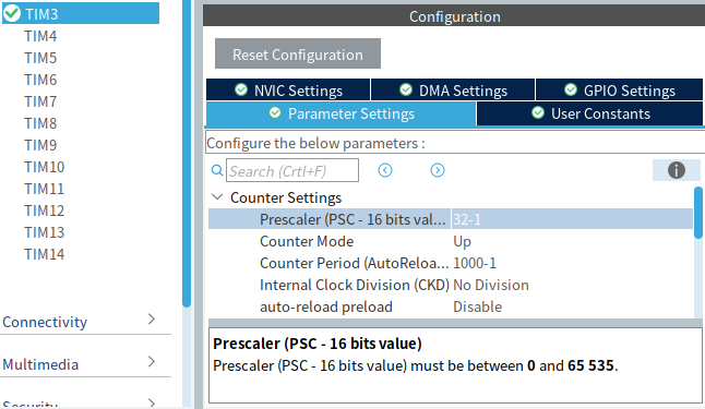 Prescaler와 Count Period 모두 0부터 시작하므로 원하는 값에서 1을 빼주었다.