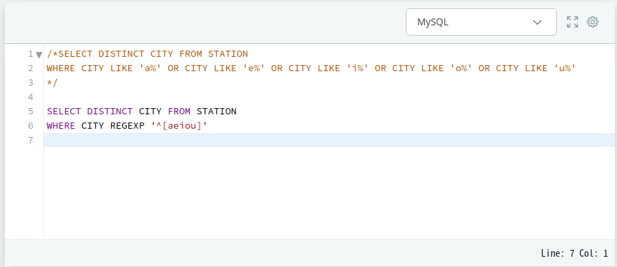 a,e,i,o,u 로 시작하는 CITY를 중복없이 찾는 문제