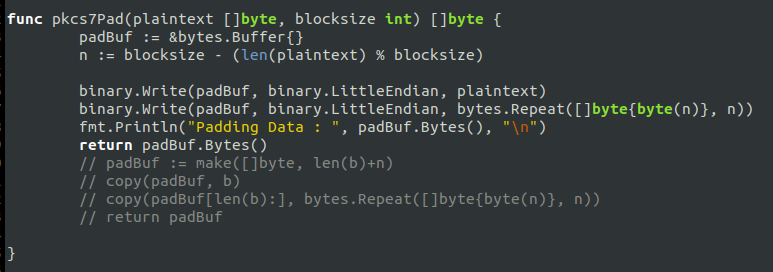 pkcs7Pad 패딩을 할 때는 빈 byte slice를 만들어 copy할 수도 있지만, 버퍼를 만들어 추가하는 형식으로 했다.