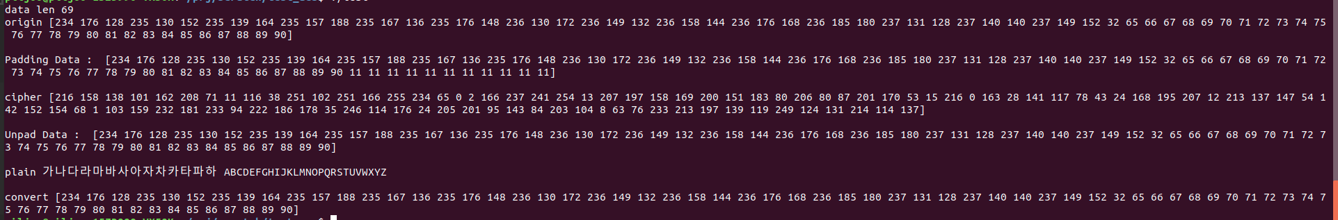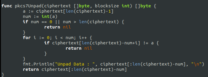 pkcs7Unpad 언패딩은 암호문의 맨마지막 수를 읽고, 해당 수 만큼을 제외하고 나머지를 읽도록 하였다.