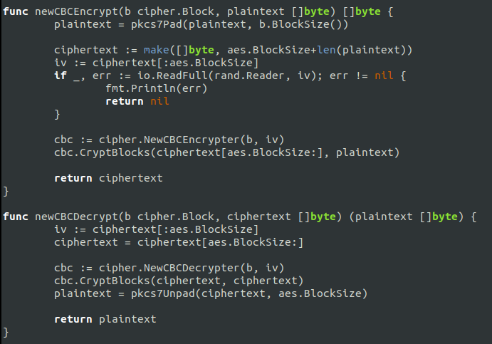 CBC 암호화전에 pkcs7Pad 해주고, 복호화하고 pkcs7Unpad 해주면 된다.