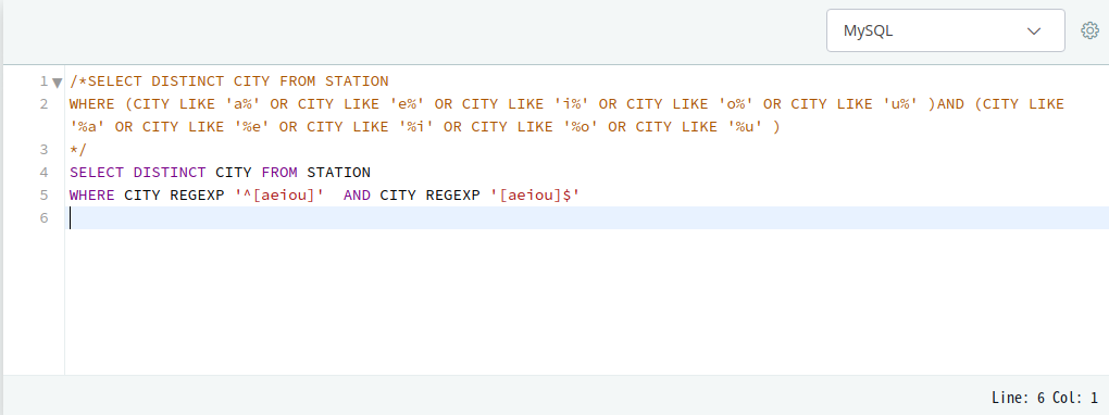 STATION 테이블에서 a,e,i,o,u로 시작하고 a,e,i,o,u로 끝나는 CITY를 찾는 문제