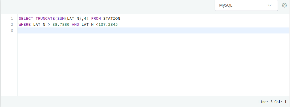 LAT_N이 38.7880 보다 크고 137.2345 보다 작은 수들의 합을 구하고 소수점 4째짜리 까지 표현하는 문제