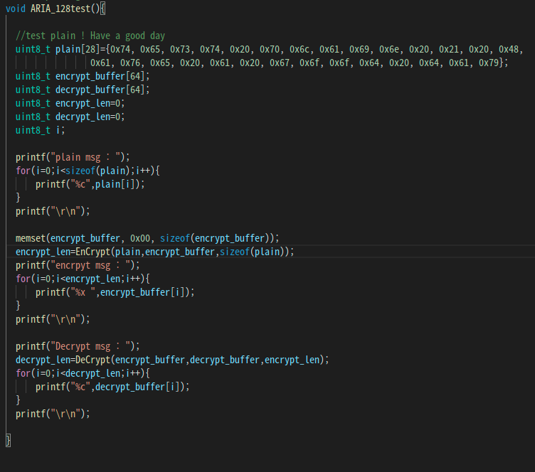 해당 두 함수를 이용하여 ARIA128_test 함수를 만들었다