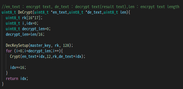 기존 EncKeySetup 함수와 DeckeySetup 함수를 그대로 이용하였고 단순히 128비트 암호화를 사용하기 쉽게 함수만 2개 추가하였다